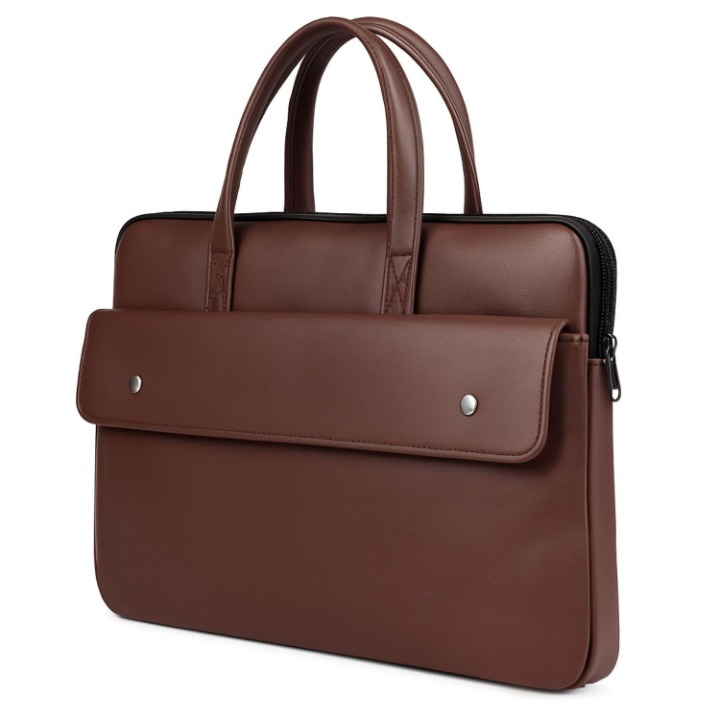 Dual Compartment Design: Features 1 padded main compartment with a dual zipper for laptop storage and 1 front compartment for accessories or a tablet. The dual metal button closure on the front adds security and elegance.