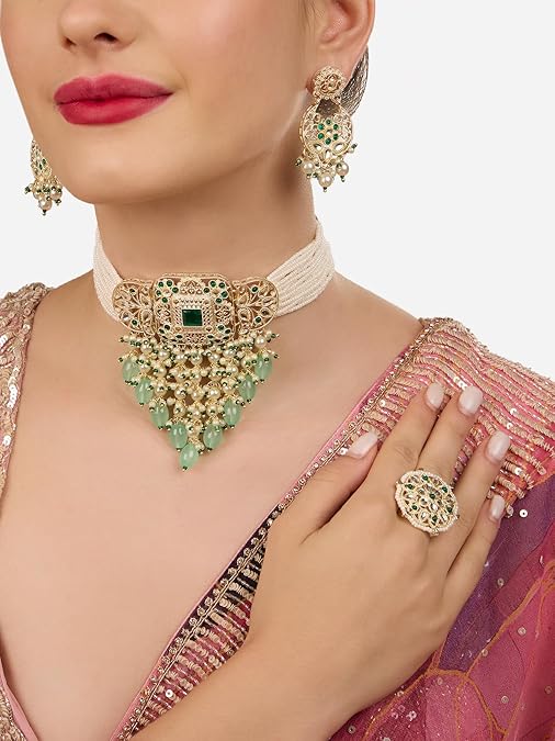 Poojavi Green Stones Beads Multistrand Cascading Choker Necklace Earring & Ring Set For Women