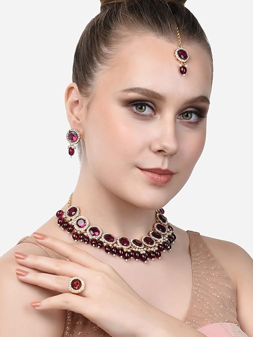 Poojavi Wine Color Stones & Cluster Beads Choker Necklace Earring Maangtikka & Ring Set For Women