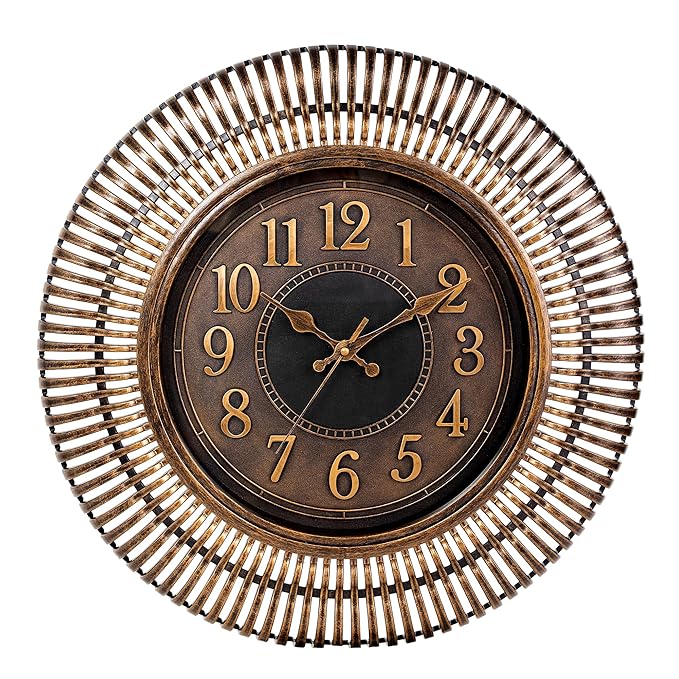 DESIGN: Stunning vintage-inspired sunburst wall clock featuring a radial pattern frame in bronze and gold metallic finish