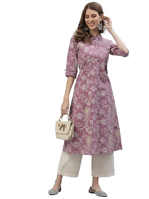 Floral Printed Rayon A-Line Kurta with Wooden Button Detailing
