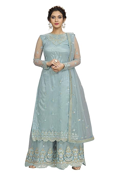 Women’s Net Embroidery Salwar Suit Kurta Sharara Set with Dupatta Skyblue