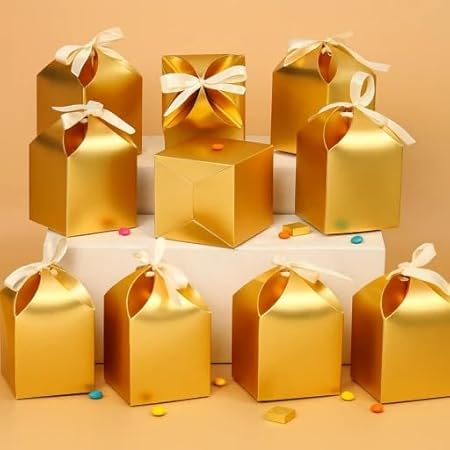 Package Includes: 12 Pcs Decorative Folding Paper Boxes | Color: Golden | Size: 12 cm x 8 cm (H x L) | Perfect for gifting chocolates, dry fruits, return favors, and festive celebrations.