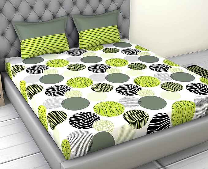 A QUALITY LINEN BRAND 100% Pure Cotton Bedsheet for Double Bed, 144TC Soft & Breathable Double Bed Bedsheet with 2 Pillow Covers (Green and Grey Black Circle, 84 x 94 Inches)