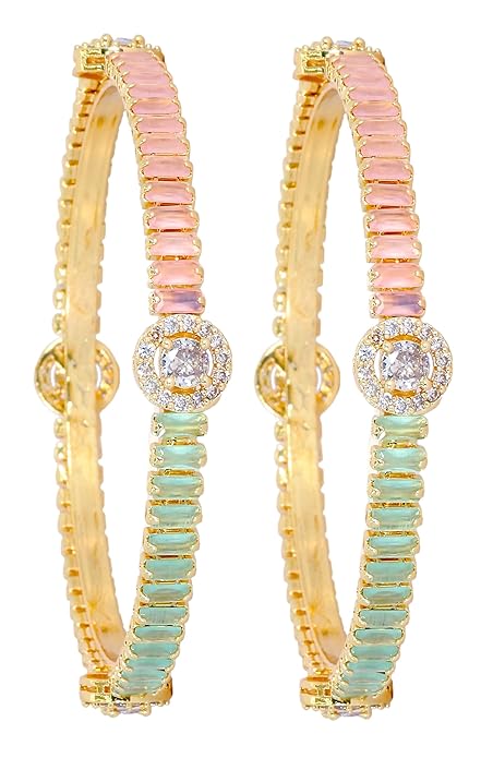 MATERIAL:- Alloy Metal | STONE:- American Diamond | Color:- Gold-Mint-Pink | SIZE:- 2.8 Inches | Pack of 2 Bangles