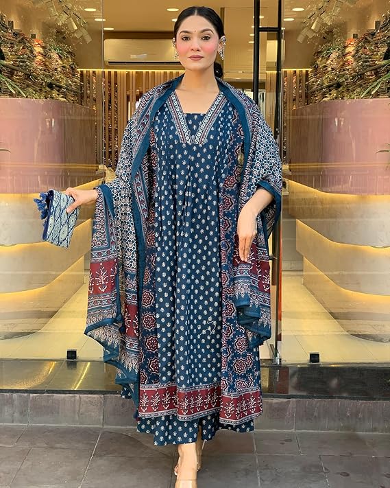 Anarkali Kurta Set with Dupatta Pure Cotton Suits for Women with Dupatta | Suit Set for Women Cotton | Ajrakh Print 3 Pcs Ethnic Wear