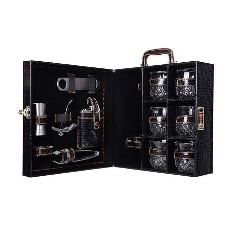 Black Big Premium Bar Set With 6 Whiskey Glasses | Portable Leatherette Set for Picnic, Travel and Car