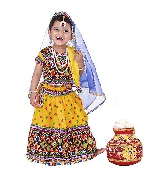 EASY TO MAINTAIN AND CARE: This Radha getup set for kids with Krishna Jayanthi accessories can be hand washed with warm water using a mild detergent or soap. Gently rub the dress to remove stain marks. Hang to dry, do not bleach and iron on low heat to maintain the novelty. You can wipe the accessories with a dry cloth to remove dust. 3 Months