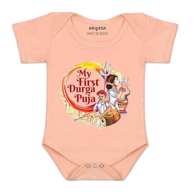 First Durga Puja R-1094 Dussehra Navratri Durga Bodysuit, Sleepsuits, Rompers For New Born Baby Clothes 0-3 Months Unisex Stylish Dress For Baby Boy & Girl, Newborn Infant Outfit