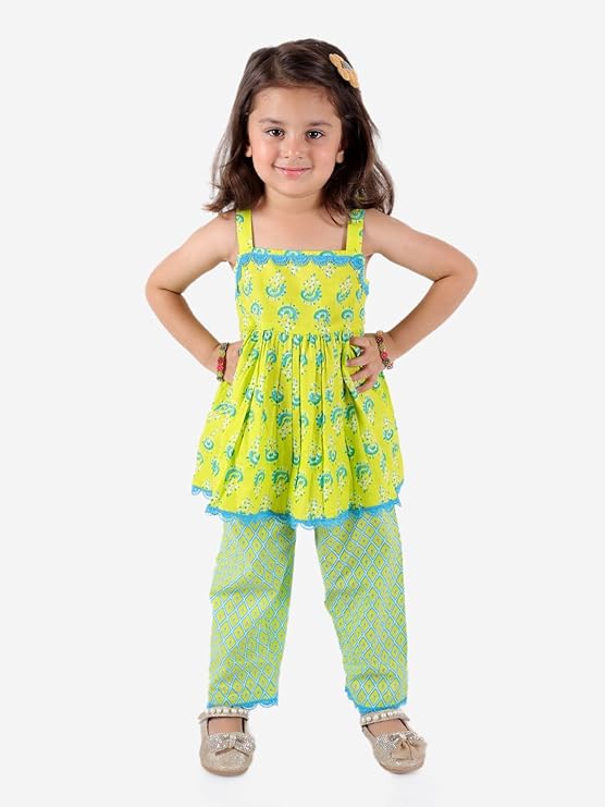 Elegant Sanganeri Cotton Kurti: The product features a sleeveless Jaipuri Sanganeri printed kurti made from Cambric Cotton Fabric. The kurti is designed with vibrant colors, showcasing an elegant and graceful ethnic look for baby girls.
