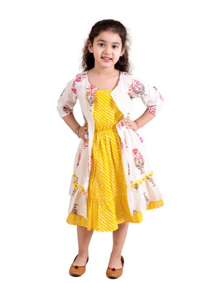 Girls Yellow Striped Cotton Midi Dress With Printed Shrug (Yellow)