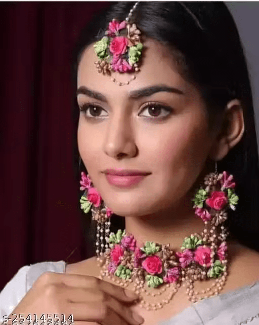 + Free ShippingName : Handmade artificial flower Jewelery Mangtika with earrings for women Fashion haldi jewelry flower Jewellery Floral jewelry Mahendi jewelry jewelry bridal jewelry Weddig Jewelery baby shower