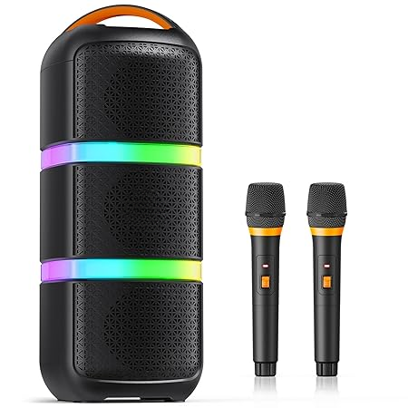 Karaoke Speaker with 2 Wireless Microphones, Powerful Bass, RGB Lights, 3 EQ Modes, 8H Playtime, USB/TF/AUX/Bluetooth 5.1, Ideal for Home & Outdoor Party