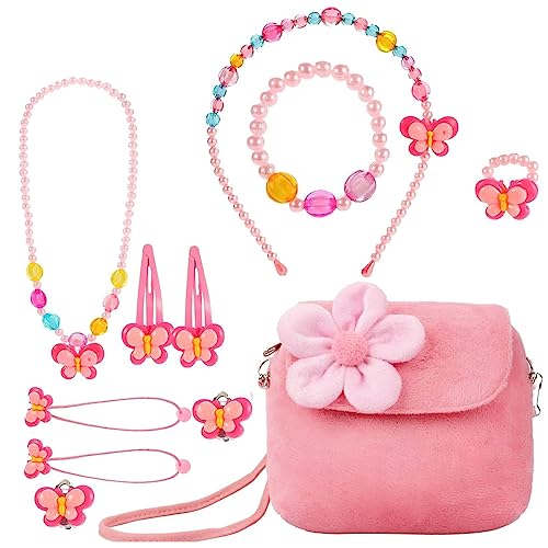 Kids Jewellery Set for Girls, Plush Handbag, Necklace, Bracelet, Ring, Hairband, Hair Clips Kit, Cute Jewellery Princess Party Costume Jewelry for 3-10 Years Old Birthday Christmas Gifts