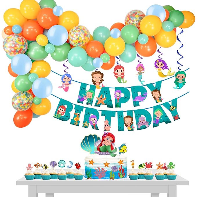 83 PCS | ELEGANT MERMAID BIRTHDAY DECORATION: Make your kids birthday astonishing with the special Mermaid combo.This package includes 1 pc mermaid happy birthday banner(cardstock), 10 pcs yellow balloon, 10 pcs green metallic balloon,10 pcs orange metallic balloon, 10 pcs mint green metallic,10 pcs light blue metallic, 2 pcs confetti balloons for decoration, 6 pcs swirls and 24 Pcs cake topper. ORDER THIS COMBO NOW!