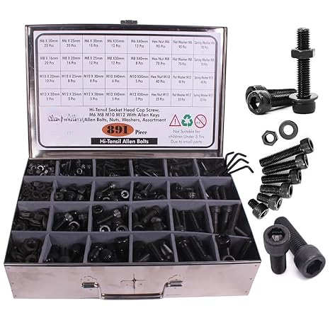 Metric M6 M8 M10 M12 Hi-Tensile 12.9 Alloy Steel Socket Head Cap Screw Allen Bolt With Matching Hex Nuts,Washer & Allen Keys Assortment Pack with SS Box 891 Pcs Pack
