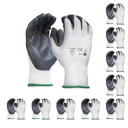 Nitrile Safety Gloves for Men ? Pack of 10 Pairs | Industrial, Construction, Gardening, Farming, Glass & Metal Handling | Cut Resistant Nylon Hand Gloves ? White
