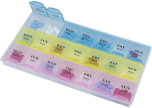 ONE COMPARTMENT PER DAY: With this large pill organizer, each of the weekly pill organizers have separate divider compartments so you can fit more medication or vitamins. Theres plenty of room for all of your larger size pills so you know that they all fit nicely into each pill case even room left over.