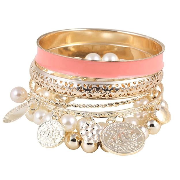 Pearl Charm Bangle Multilayer Bracelet for Women and Girls (Pink) (rr6762b)