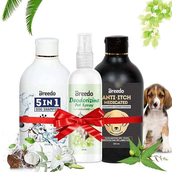 Poojavi (Combo Of 3) Dog 5 In 1 Shampoo +Anti-Itch Shampoo(500 Milliliter)+ 100 Milliliter Natural Dog Body Deodorizer Spray Natural Itch Relief Dog Shampoo For Labrador, German Shepherd, Gold