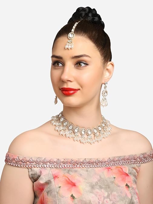 Poojavi Gold Tone Austrian Diamonds Artificial Stones & Beads Bridal Choker Necklace Earring & Maangtikka Set For Women