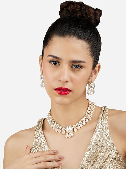 Poojavi Gold Tone Austrian Diamonds Artificial Stones & Beads Necklace & Earring Set For Women