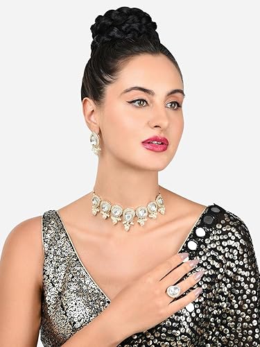 Poojavi Gold Tone Austrian Diamonds Kundan Choker Necklace Earring Ring Set For Women