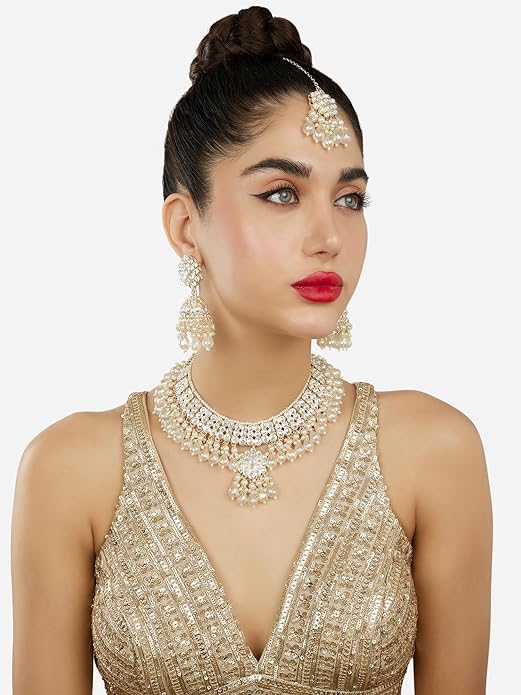 Poojavi Gold Tone Dazzling Kundan Cluster Beads Drop Necklace Earring Maangtikka Set For Women