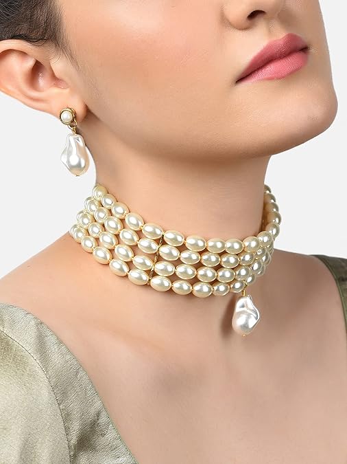Poojavi Gold Tone Ethnic Pearls Choker Necklace & Earring Set For Women