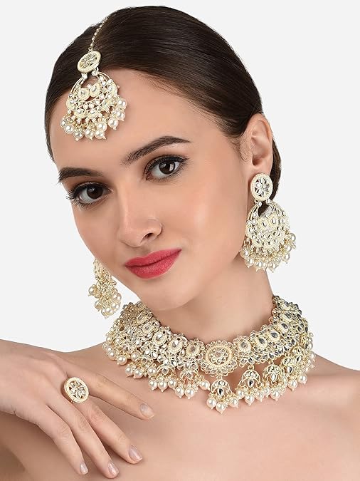 Poojavi Gold Tone Kundan & Pearls Bridal Necklace Earring Maangtikka & Ring Set For Women