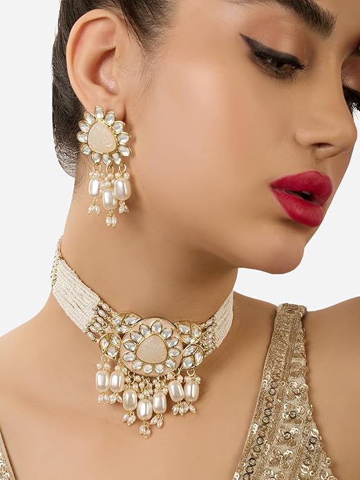 Poojavi Gold Tone Meenakari Multistrand Beaded Kundan Choker Necklace & Earring Set For Women