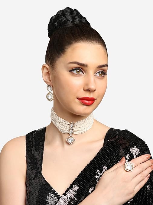 Poojavi Gold Tone Multistrand Beaded Austrian Diamonds Choker Necklace Earring & Ring Set For Women
