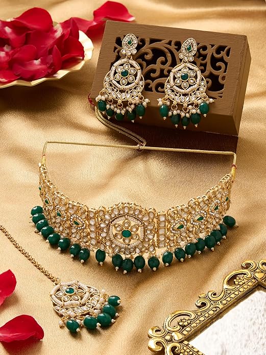 Poojavi Green Beads Dazzling Kundan Choker Necklace Earring & Maangtikka Set For Women
