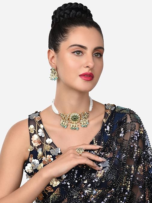 Poojavi Green Beads & Kundan Choker Necklace Earring & Ring Set For Women