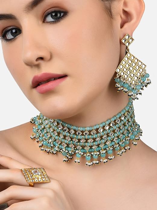 Poojavi Green Beads Traditional Kundan Choker Necklace Earring & Ring Set For Women