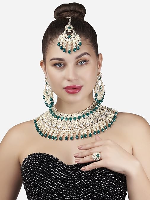 Poojavi Green Bridal Kundan Necklace Earring Maangtikka & Ring Set For Women