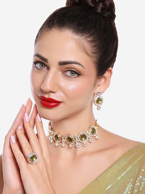 Poojavi Green Kundan & Austrain Diamonds Choker Necklace Earring & Ring Set For Women
