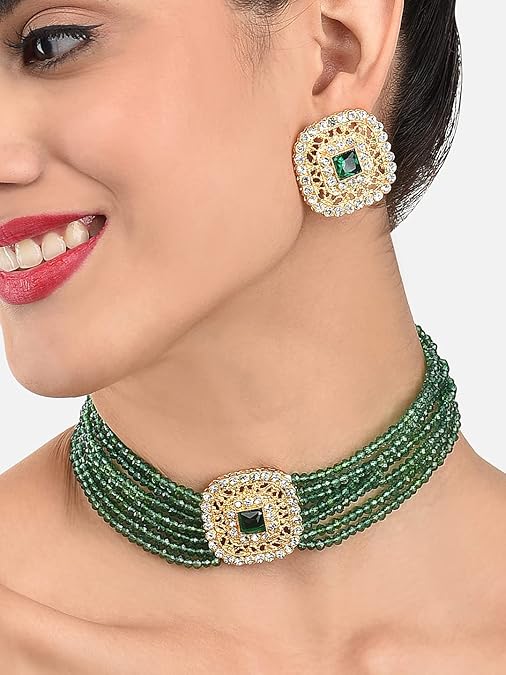 Poojavi Green Multistrand Crystal Beads Choker Necklace & Earring Set For Women