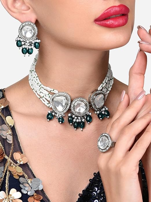 Poojavi Green Multistrand Dazzling Stones Choker Necklace Earring & Ring Set For Women