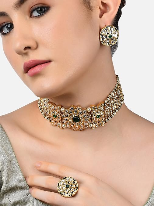 Poojavi Green Traditional Kundan Choker Necklace Earring & Ring Set For Women