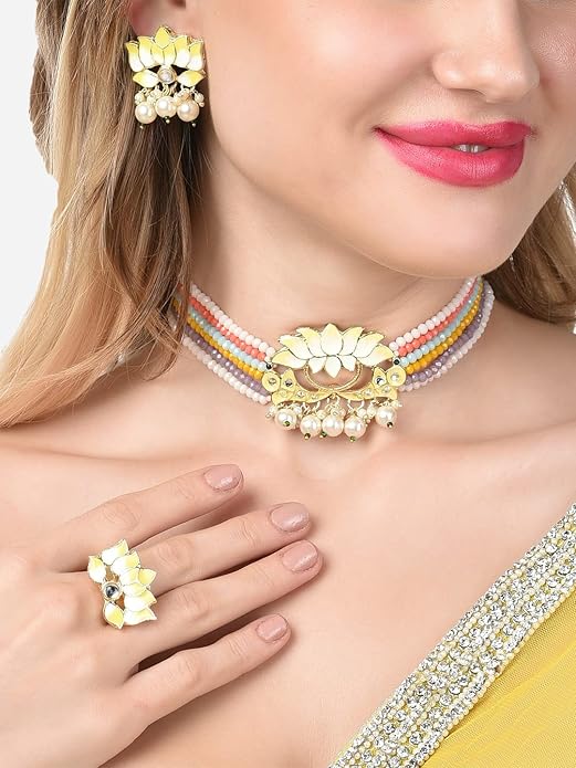 B0BFS3DCHX Feature: You can never go wrong with a choker necklace! Indian style choker necklaces have been a staple at bridal parties and traditional events since forever & why not? Beautifully crafted and bedazzled with gems they?re perfect with ethnic outfits! A choker necklace is the type of fashion accessory that has the potential to upgrade the simplest of traditional outfits! Wear it to traditional events or weddings. We thought why not save this gorgeousness for you!
