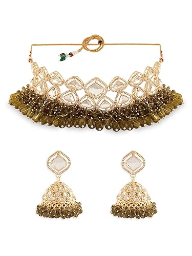Poojavi Mehndi Green Cluster Beads Dazzling Austrian Diamonds Stones Choker Necklace & Earring Set For Women