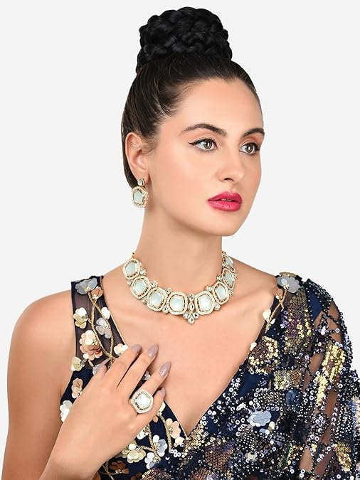 Poojavi Mint Green Stones Dazzling Austrian Diamonds Kundan Necklace Earring & Ring Set For Women