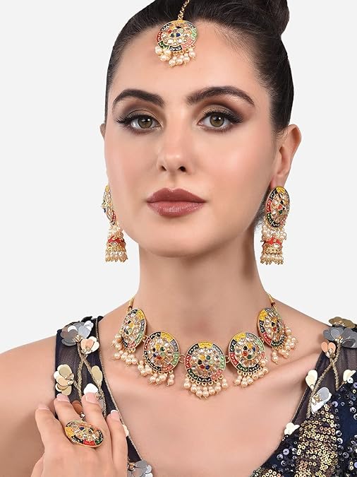 Poojavi Multicolor Meenakari Flower Design Choker Necklace Earring Maangtikka & Ring Set For Women