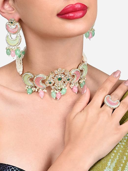 B0C4TV2TD3 Features: For most of the people, fashion is about the outfits but what puts together an outfit and completes the look is the right set of accessories. Indian weddings & Festivals are a colourful affair. Haldi, Mehndi, Pooja every function reflects its own aura. Another trending pieces of jewellery that is becoming increasingly popular at weddings or occasions are necklace earring & ring set. This combination looks amazing with a lehenga or with a Sharara.