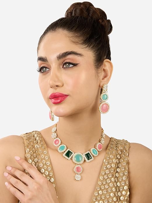 Poojavi Multicolor Stones Dazzling Austrian Diamonds Necklace & Earring Set For Wome