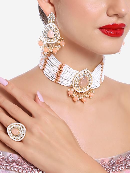 Poojavi Orange Multistrand Kundan Stones & Beads Choker Necklace Earring & Ring Set For Women