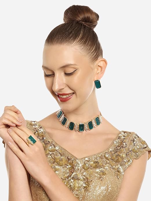 Poojavi Peacock Green Artificial Stones & Kundan Choker Necklace Earring & Ring Set For Women