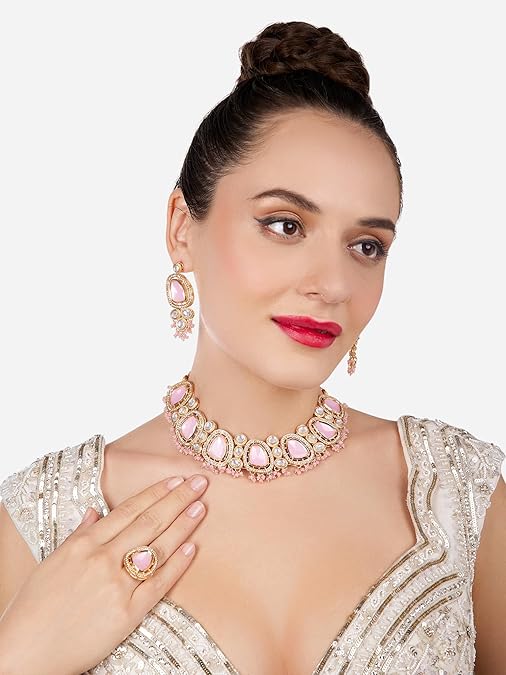 Poojavi Pink Artificial Stones & Beads Choker Necklace Earring & Ring Set For Women