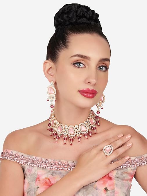 Poojavi Pink Colour Artificial Stones & Beads Choker Necklace Earring & Ring Set For Women